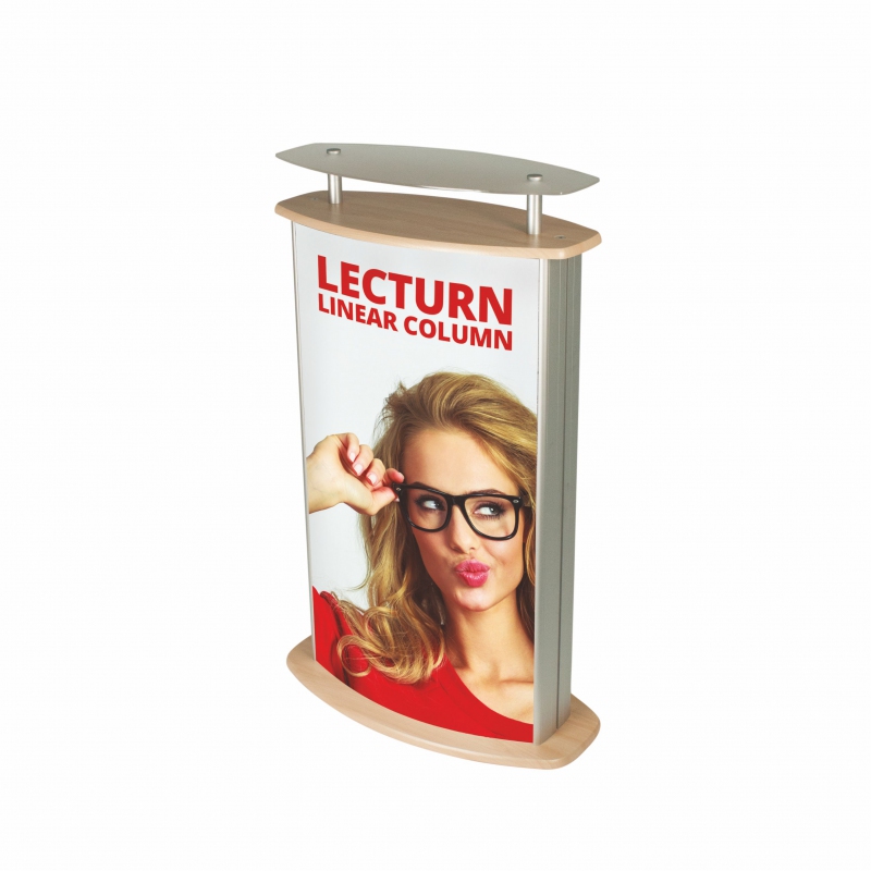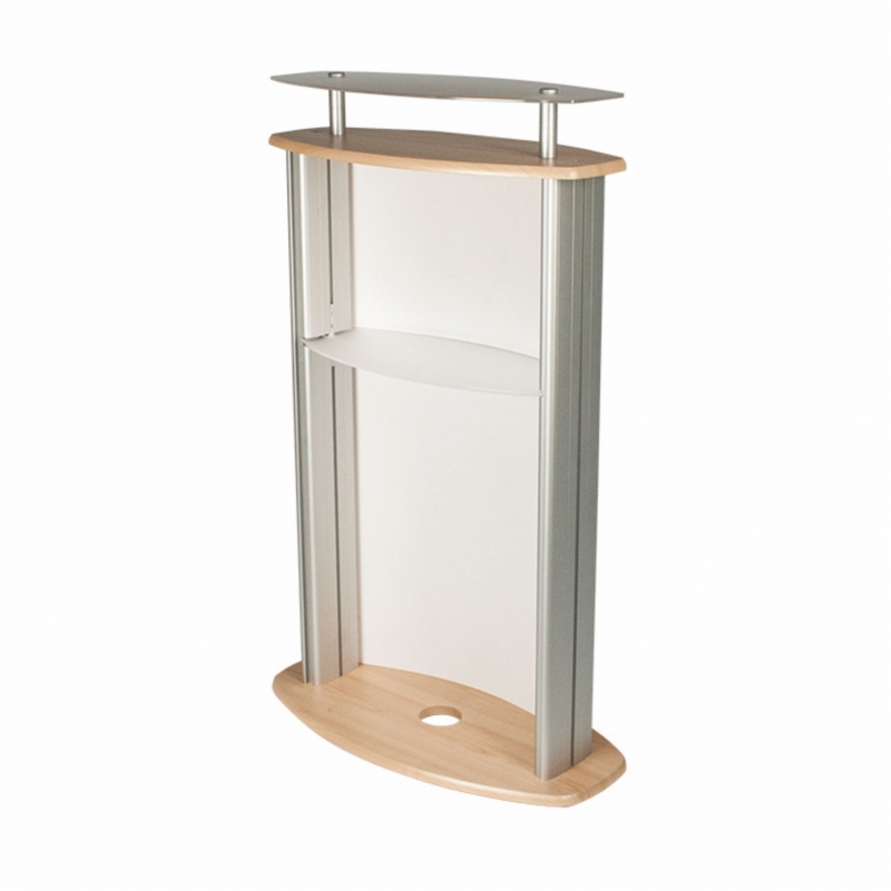 Atraktivní a moderní prezentační stolek s akrylátovou deskou, která je umístěna na dvou nožkách nad hlavní deskou. Tento stolek je ideální pro prezentace na různých konferencích. Štíhlý profil je velmi elegantní a je vyroben z hliníkovývh sloupků. Přední grafický panel z PVC desky ve výměnný. Stolek je dodáván včetně vnitří poličky pro uložení nezbytností, které budete při prezentaci potřebovat. Hlavní desku lze objednat v barvách černá, bílá, stříbrná a buk.