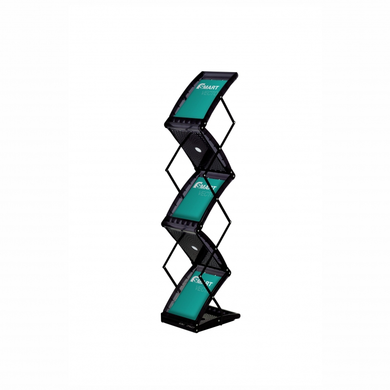 Novinka mezi stojany na reklamní literaturu. Stojan je lehký, dobře přenosný a jeho složení a rozložení Vám nebude dělat sebemenší problém. Podložky v zásobnících na literaturu jsou podloženy plastem. Ocelová postranní ramena zaručí výbornou stabilitu a odolnost vůči každodennímu použití. Stojan je dodáván včetně praktické brašny.